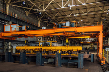 Magnetic gripper for crane. Industrial lifting magnet in a steel structure factory.