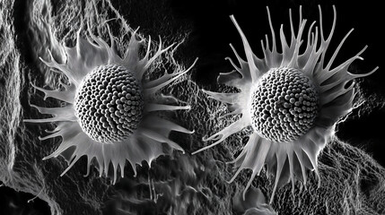 Ultra high resolution electron microscopy of pancreatic cancer cells invading surrounding healthy tissue highlighting abnormal cell membranes dense nuclei