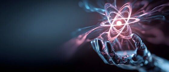 Atom Energy: A glowing, stylized atom with orbiting electrons radiates with vibrant energy, symbolizing the core of matter and the boundless potential of the universe.