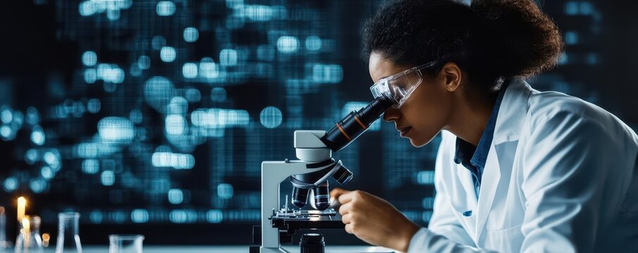 Scientist examining samples under a microscope with a backdrop of digital data projections, laboratory, scientist, experiment, fusion of biology and data science
