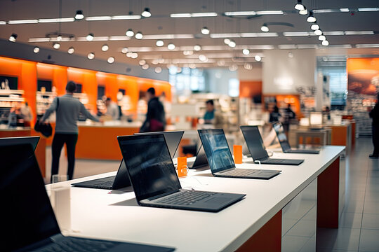 A modern electronics store with a variety of laptops and gadgets on display, offering a wide selection for consumers.