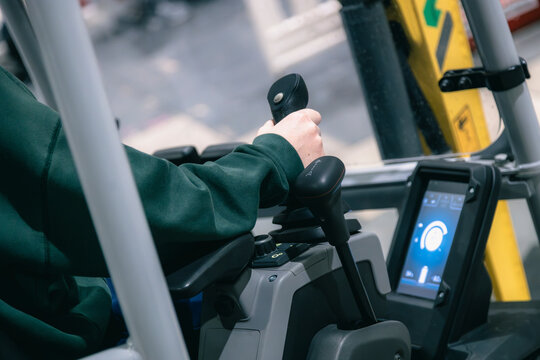 Man hand using interactive touchscreen display of electronic multimedia terminal at modern museum or exhibition. Evening time, low light illumination. Education, futuristic and technology concept