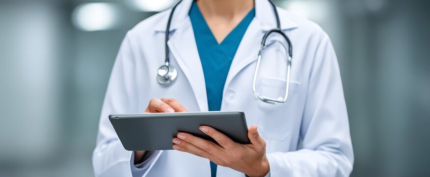 Digital healthcare concept with doctor updating electronic health records, showcasing health information EMR system, medical data, online documentation and patient files.