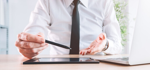 Loan officer and banker offering stylus and pad to sign document with electronic signature