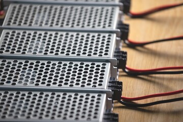 Close up of the metal mesh cases of power supply