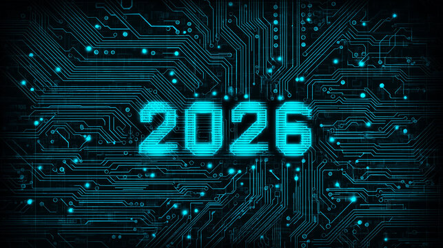"2026" tech circuit vector design, electronic pathways and nodes, digital technology aesthetic, cyan and electric blue, motherboard inspired pattern, futuristic vector illustration