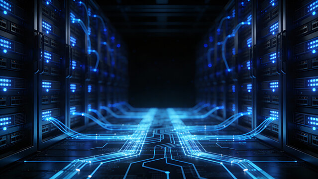 Digital tunnel or portal. Electronic data pathways and glowing structures converge toward a brilliant, distant light source. Colorful hues illuminate the scene