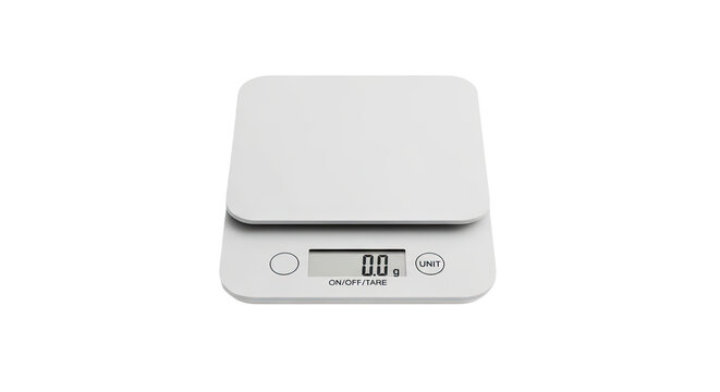 Electronic kitchen scale displaying zero grams on transparent background