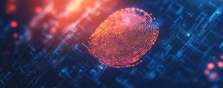 A vibrant digital fingerprint surrounded by abstract technology elements, symbolizing security and identity verification in the digital age.