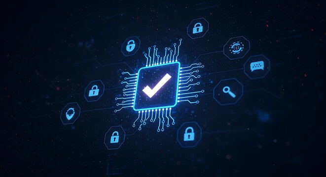Electronic validation in a network, symbolized by a bright check mark on a circuit board, amidst security and identification icons.