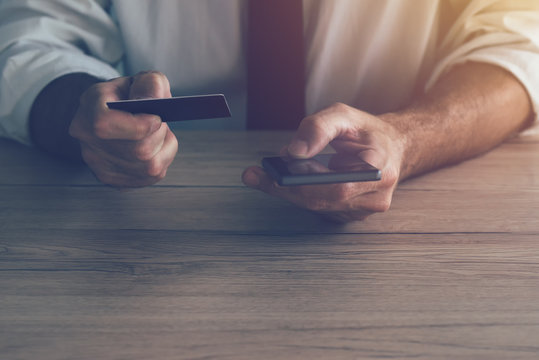 Close-up of a man's hand holding a green credit card over a laptop, finalizing an online payment