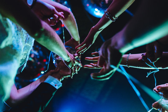 Crowd listen to a DJ at a dance music festival playing electronica, techno, garage, house with pink and blue smoke