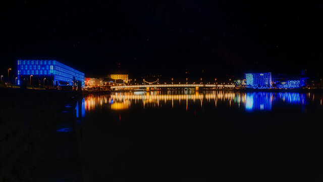 Panorama Weitwinkelaufnahme einer beleuchteten Stadt in den Nachtstunden Linz City Lentos Kunstmuseum Nibelungenbrücke Schlossmuseum Ars Electronica Center Donau