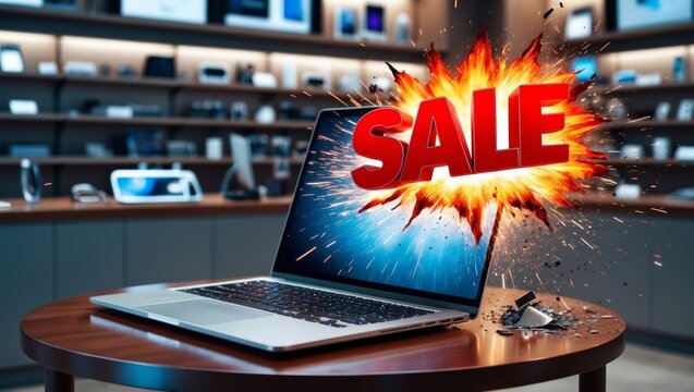 Laptop displaying explosive sale offer on screen