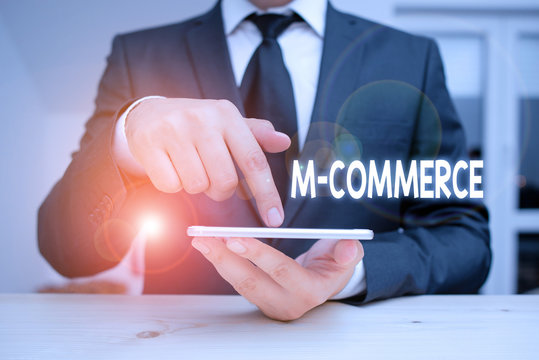 Writing note showing M Commerce. Business concept for commercial transactions conducted electronically by mobile phone