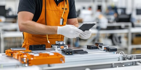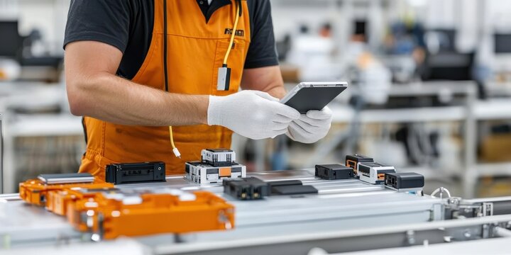 battery replacement concept. Worker inspecting electronics in a manufacturing facility.