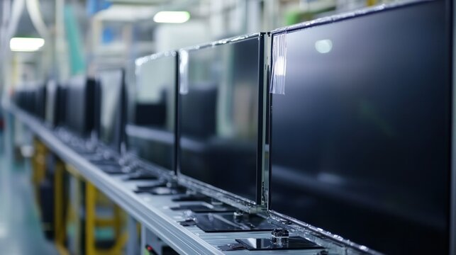 LED TV assembly line, large flat panels carefully placed into frames, protective films peeled off by gentle suction tools