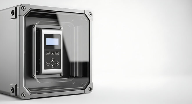 Industrial control panel with digital display and buttons inside protective enclosure, industrial control panel providing safety.