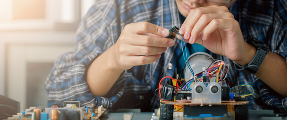Electronics technician, electronic engineering electronic repair,electronics measuring and testing, repair and maintenance concepts.uses a voltage meter to check and upgrade in shop