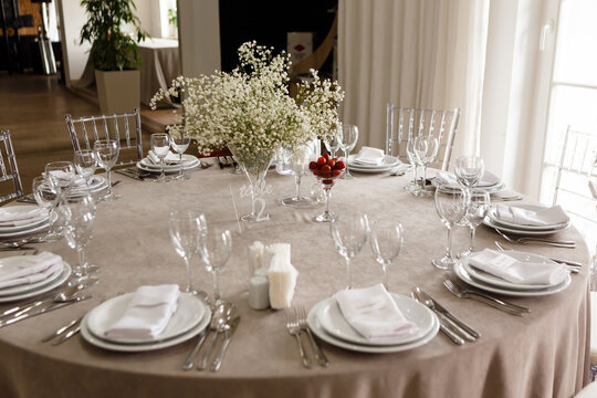 Preparing elegant dining table for wedding celebration