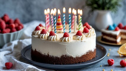 Vibrant and elegant birthday cake adorned with colorful candles, birthday, cake, celebration, dessert, candles, colorful