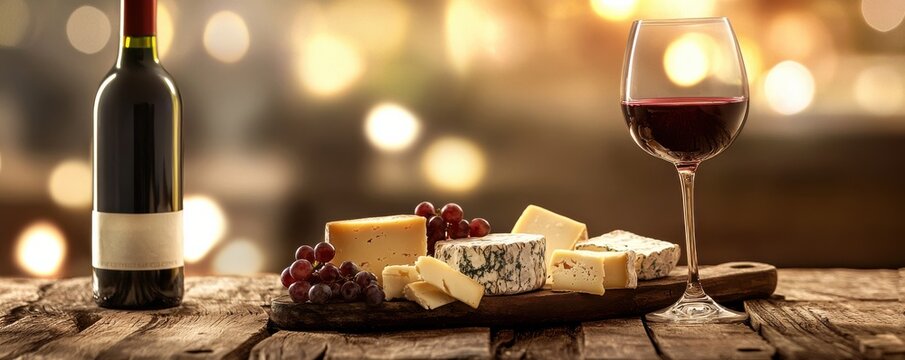 An elegant glass of red wine with grapes and a cheese platter in the background Set on a rustic wooden table