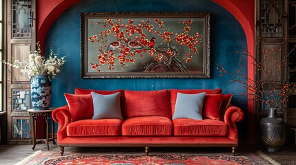 Chinoiserie folding screen features elegant white cranes, delicate cherry blossoms against vibrant red backdrop with golden sun motif. Artwork blends Japanese, Chinese cultural aesthetics, perfect