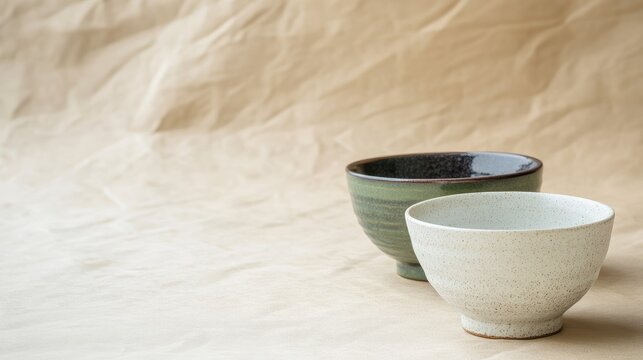 A set of traditional ceramic bowls resting on a smooth paper backdrop, leaving plenty of copy space for text or design elements