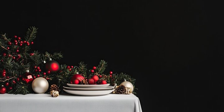 Elegant Christmas table setting with red and gold ornaments on a white tablecloth against a black backdrop creating a festive atmosphere