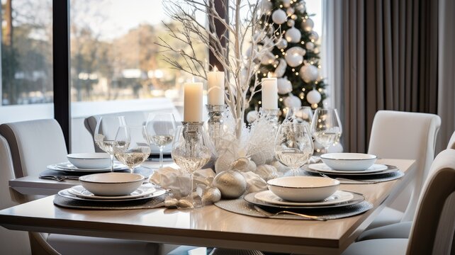 an elegant dining table set for a holiday feast. the fine china, crystal glassware, and festive centerpieces. the minimalist design that exudes sophistication.