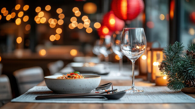 festive dining space featuring beautifully arranged table with bowl of pasta, elegant glassware, and glowing red lanterns, creating warm and inviting atmosphere