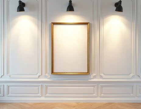 Classic Living Room Frame Mockup – Gold Frame: A timeless living room with a gold frame on an off-white wall, suitable for vintage or classical artwork.