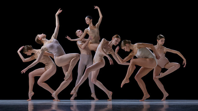 Tenderness and grace. Group of talented young people, elegant ballet dancers making performance against black background. Concept of classical and modern dance, beauty, creativity, art, theater