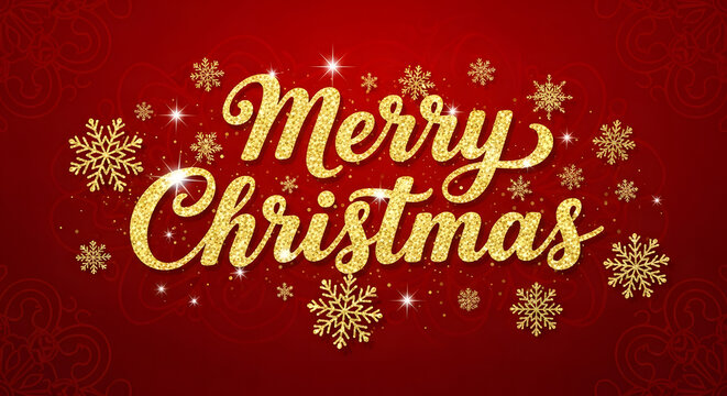 Golden glitter Merry Christmas greeting with elegant script on a rich red backdrop, featuring festive snowflakes, perfect for holiday cards and seasonal joy
