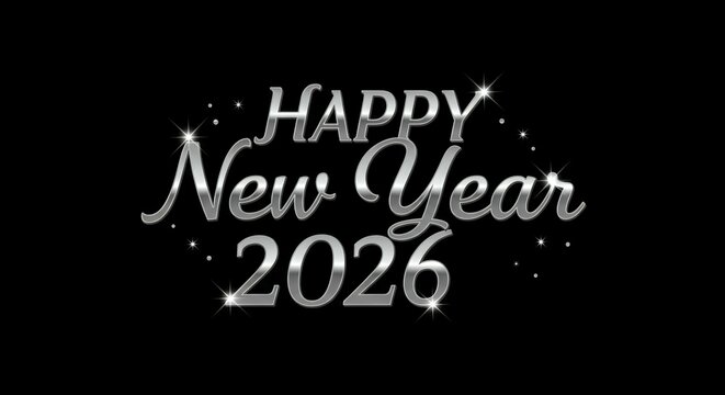Happy New Year 2026 elegant silver metallic script typography with star sparkles on black background, sophisticated celebration greeting design