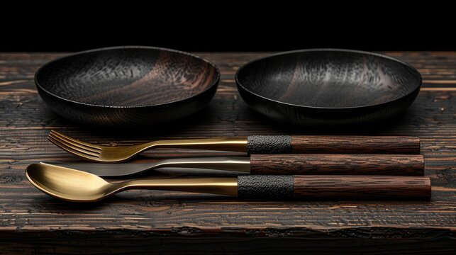 The wooden table displays a collection of dark wood and gold cutlery for a luxurious and sophisticated aesthetic.