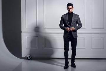 Attractive, strong, muscular young man dressed elegantly suit posing in studio, standing near wall, shadows background. Horizontal view.