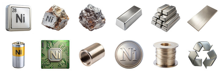 Nickel products and symbols isolated on transparent background. Features nickel bars, coins, batteries, and electronics in PNG collection