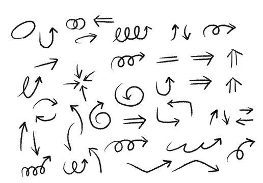 Hand drawn pencil arrows. Doodle curved chalk darts. Texture design elements of scribble lines. Hand painted crayon check