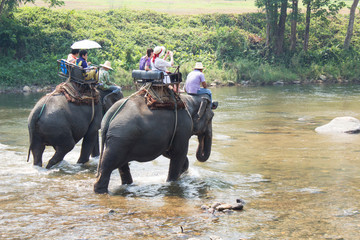 Elephant trekking Group tourists ride travel through jungle in forest Chiang mai, thailand