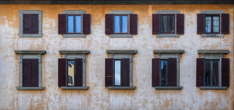 A frontal photo of an old and dirty plaster facade of an building in Italy