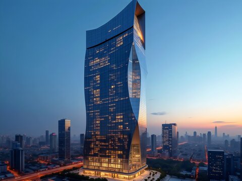 Capturing coastal skyline glowing at dusk from elevated vantage with skyscrapers, harbor lights