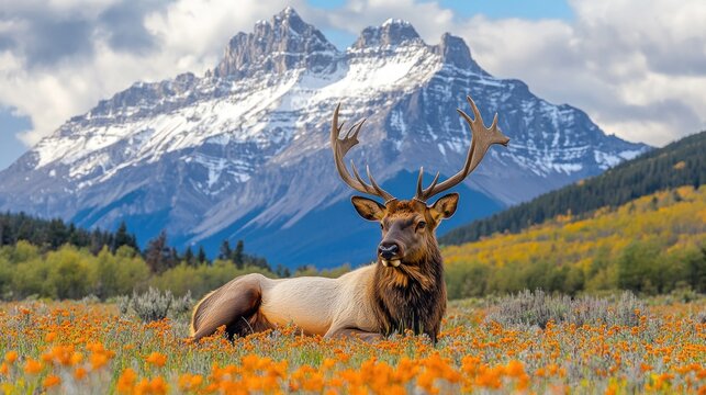Elk Grazing In Autumn Field With Scenic Mountain View Images