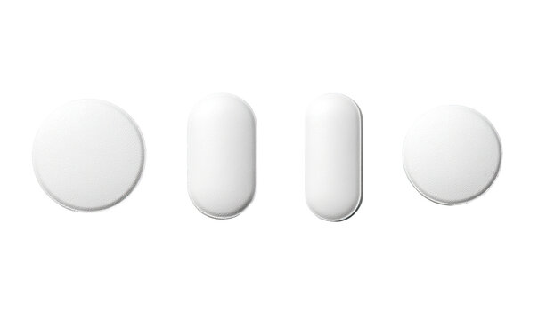 Four white pills of varying shapes, circular and oval, displayed in a row