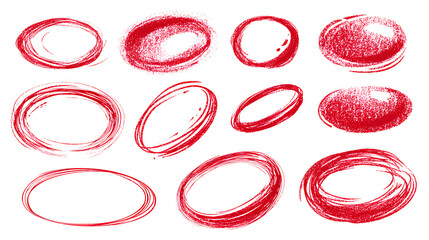 Red Hand drawn marker red circles round set. Doodle round shapes. Crayon circle highlight, freehand ovals doodle. Chalk pencil ellipse frames, round shapes in sketch style. no background