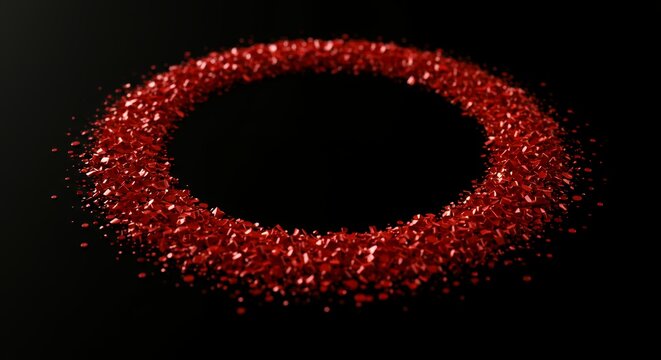 Dense red geometric particles forming horizontal elliptical ring with scattered distribution on dark background for abstract data and technology design