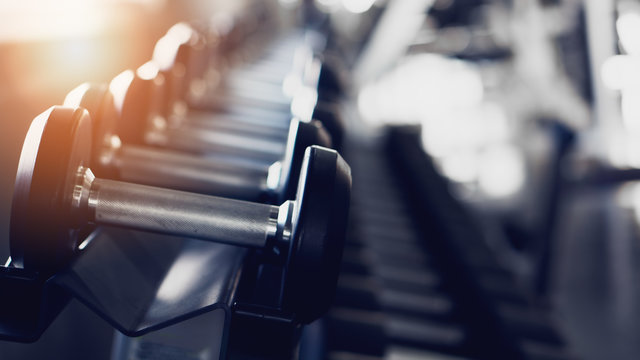 gym interior background of dumbbells on rack in fitness and workout room