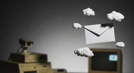 Conceptual image of email envelope floating in the cloud near vintage computer equipment and CCTV camera symbolizing digital communication, data privacy, and surveillance risks with retro technology.