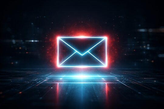 Futuristic neon email icon on dark background with red and blue glow