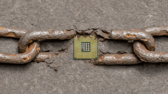 Rusty chains with stars embedded, stretching across barren landscape under dramatic sunset.